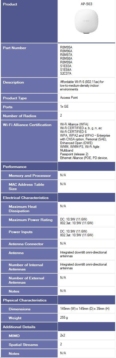 The Aruba 503 Series Access Points (APs) provide cost-effective, high-performance connectivity for any organization experiencing device growth due to increased mobility, the shift to cloud, or IoT. With a maximum real-world aggregate data rate of 1.49 Gbps (HE80/HE20), the 503 Series deliver the speed and reliability needed for medium-density venues and workplaces such as schools, midsize offices, and retailers. Each 503 Series AP provides connectivity for a maximum of 256 associated clients per radio (512 in total).