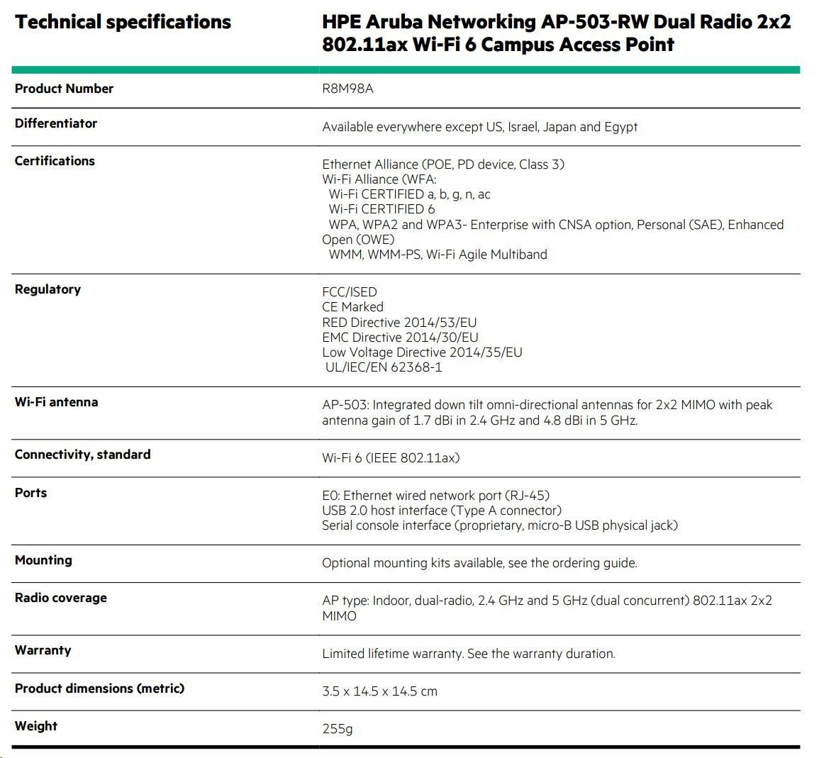 5x HPE Aruba Networking AP-503-RW Dual Radio 2x2:2 802.11ax Wi-Fi 6 Campus Access Point ( 5x R8M98A )