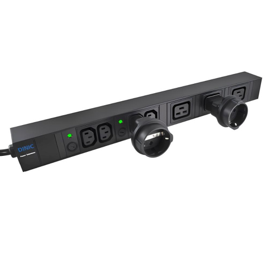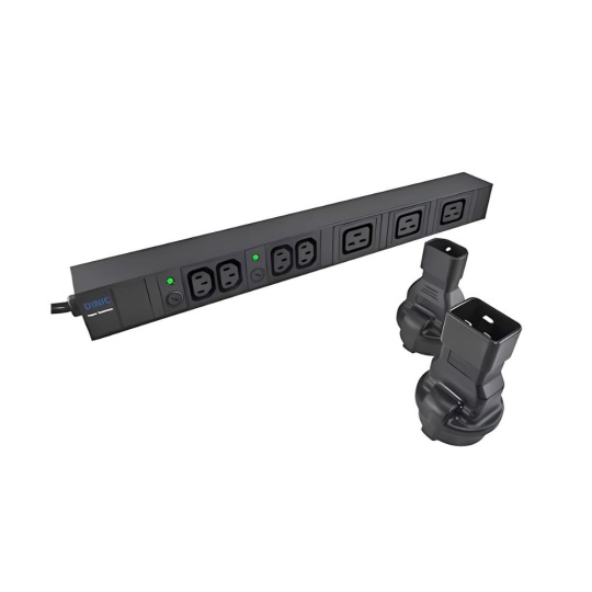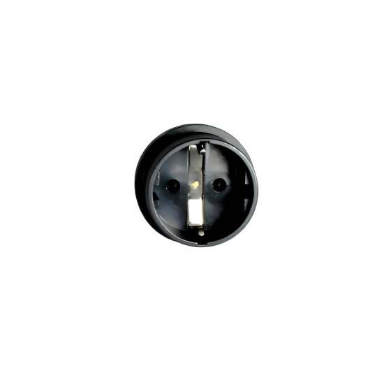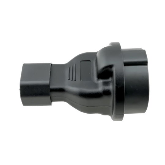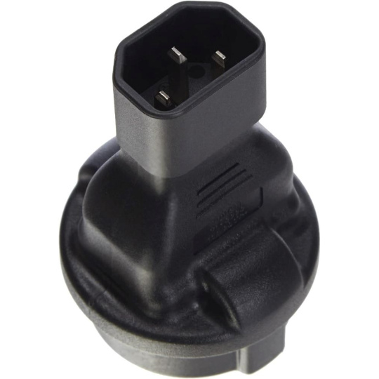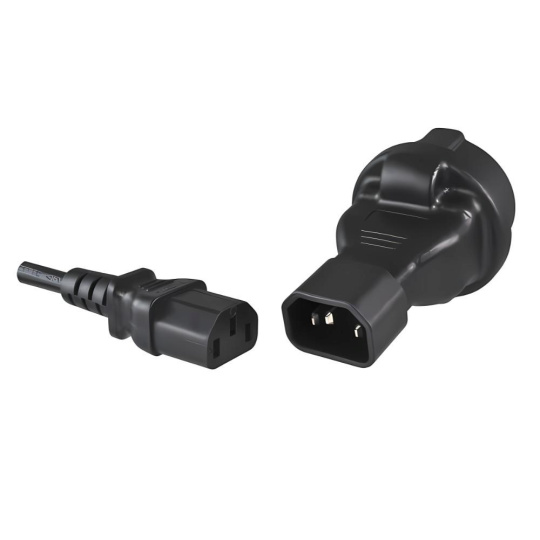 Napájecí adaptér v černém provedení pro UPC, se vstupním konektorem IEC C14 (max. 10 A) a výstupní zásuvkou SCHUKO CEE 7/3 (max. 16 A). Výstupní zásuvka je rovná, německého typu, s ochrannými plíšky po stranách, vhodná pro připojení vidlic vybavených zemnícími plíšky. Je velmi důležité zajistit, aby proud odebíraný ze zásuvky nikdy nepřekročil 10 A, aby nedošlo k přetížení vstupního konektoru C14.