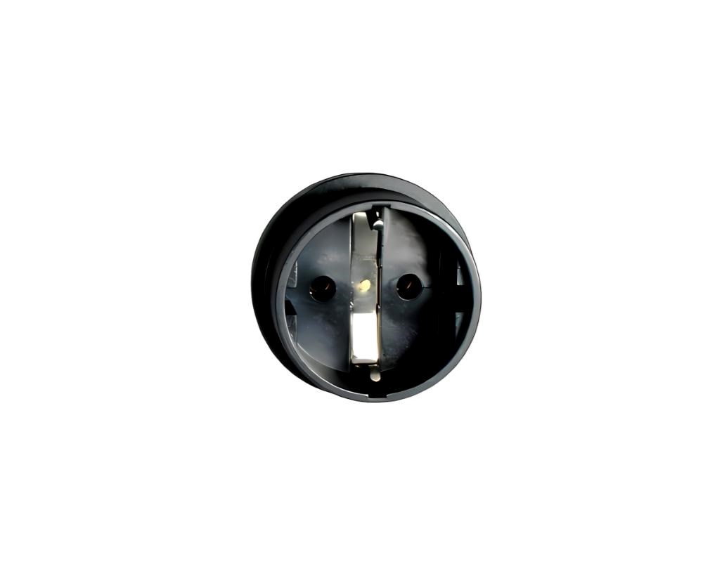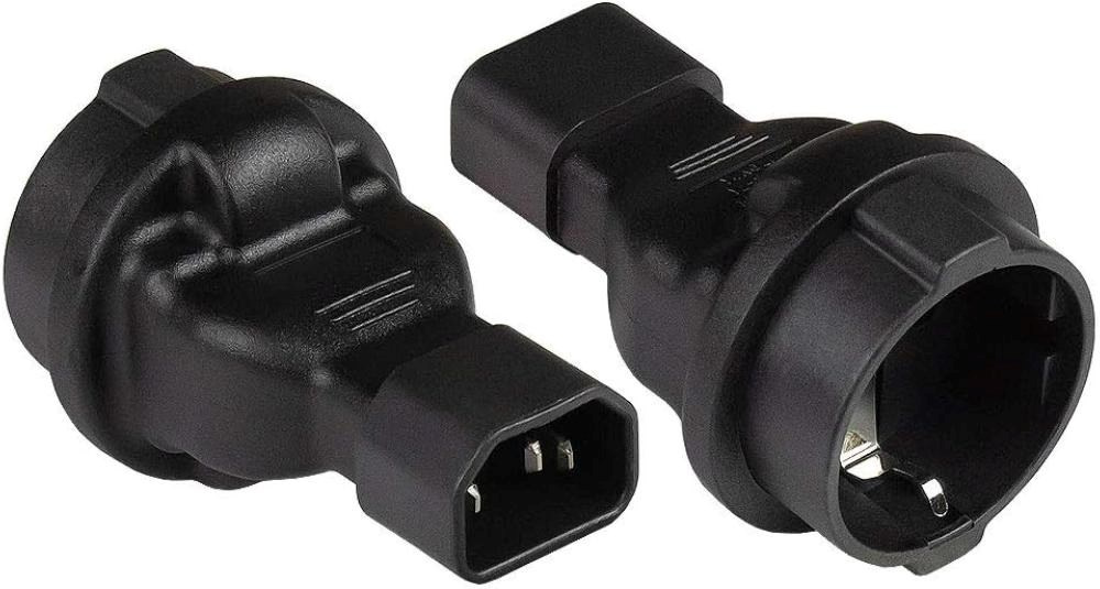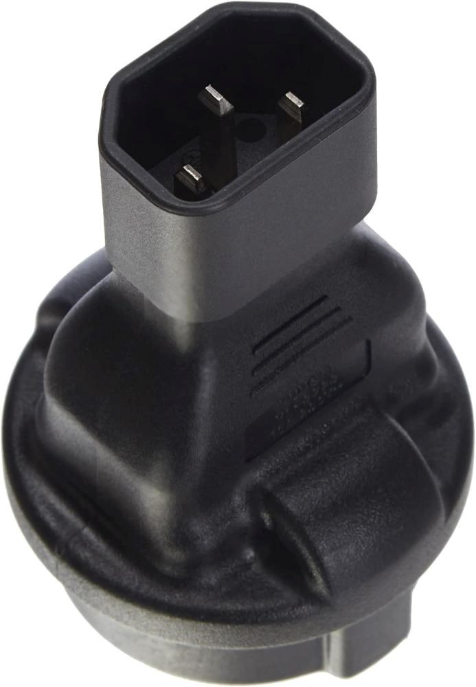 Napájecí adaptér v černém provedení pro UPC, se vstupním konektorem IEC C14 (max. 10 A) a výstupní zásuvkou SCHUKO CEE 7/3 (max. 16 A). Výstupní zásuvka je rovná, německého typu, s ochrannými plíšky po stranách, vhodná pro připojení vidlic vybavených zemnícími plíšky. Je velmi důležité zajistit, aby proud odebíraný ze zásuvky nikdy nepřekročil 10 A, aby nedošlo k přetížení vstupního konektoru C14.