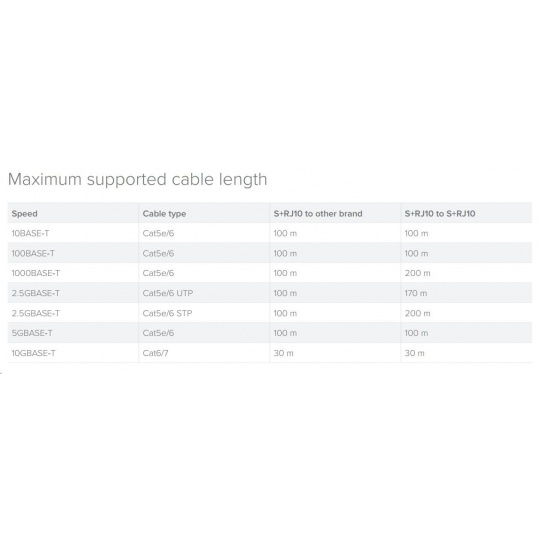 S+RJ10 je unikátní SFP+ modul, který dokáže komunikovat rychlostí 10Mbps až 10Gbps po ethernetovém kabelu. Zajímavou vlastností je schopnost 1Gbps linku až na vzdálenost 200m při instalaci mezi 2 stejné S+RJ10 moduly.