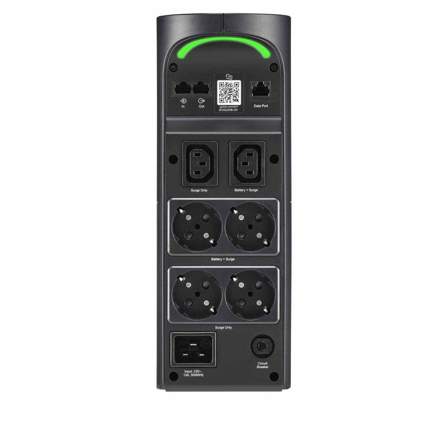 Věžová UPS 2200VA/1320W má celkem 6 zásuvek, z nichž 3 jsou záložní baterie a přepěťová ochrana a 3 jsou pouze přepěťovou ochranou. Má nárazovou energii 1080 joulů. Je vybavena automatickou regulací napětí, která koriguje poklesy a rázy napětí na správnou úroveň. Dodává se s PowerChute Serial Shutdown, snadno použitelným softwarem pro bezpečné vypnutí systému s funkcemi správy napájení a energie. Tato UPS má 3letou záruku a politiku ochrany připojeného zařízení ve výši 150 000 USD. Má 2 USB porty (Typ A + C) pro chytré nabíjení osobních zařízení.