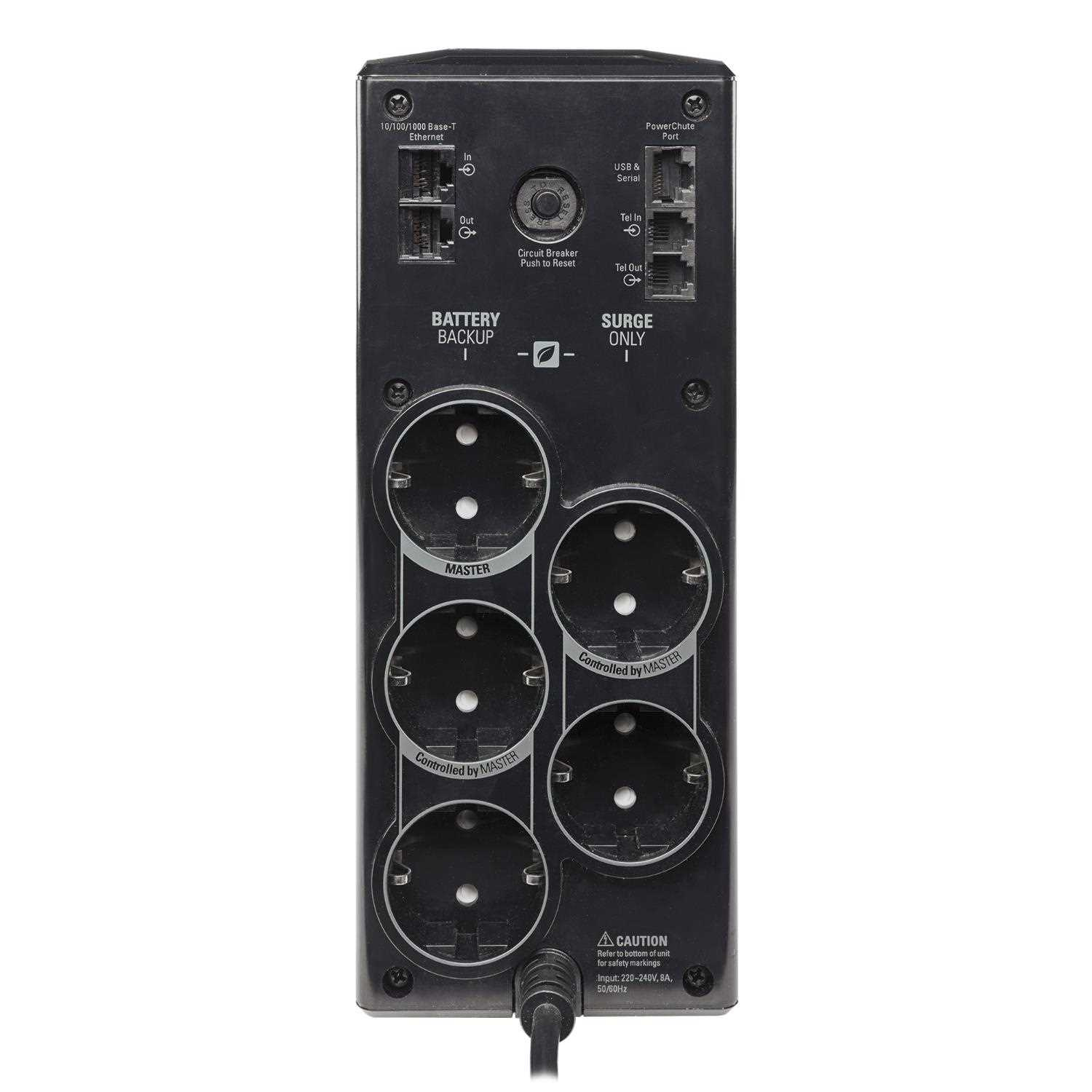 | Typ zásuvek | RJ-11 In/Out RJ45 Base-T Ethernet (3) Schuko (výstup - Záložní provoz na baterie) (2) Schuko (výstup - Přepěťová ochrana) pro ochranu laserových tiskáren, scannerů, či jiných zařízení s velkým odběrem |