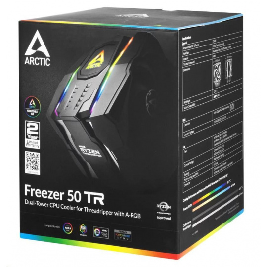 The ARCTIC Freezer 50 TR is a dual-tower CPU cooler with two P-series fans in push-pull-configuration. It is an extremely powerful cooling solution for AMD Ryzen Threadripper CPU, capable of efficiently and quietly cooling CPUs of 32 cores and beyond. The Freezer 50 TR is also ARCTIC’s first CPU cooler equipped with fully addressable RGB, grants you totally customisable illumination and an individual colour look to the PC.