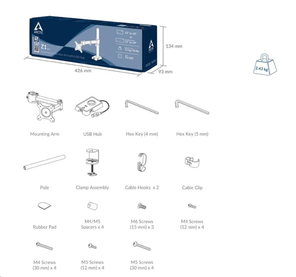 Classic 16:9 monitors are also compatible (up to 43 inches). The Z1 supports a total load of 15 kg/33 lbs.