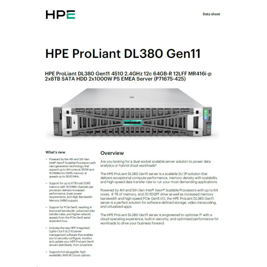 HPE PL DL380g11 4510 (2.4/12C) 2x32G (P64706) 2x8TB (834028) 2x1000W MR416i-p 12LFF 4x1Gb Smart Choice