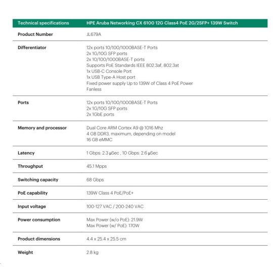 Aruba 6100 12G Class4 PoE 2G/2SFP+ 139W Switch JL679A RENEW