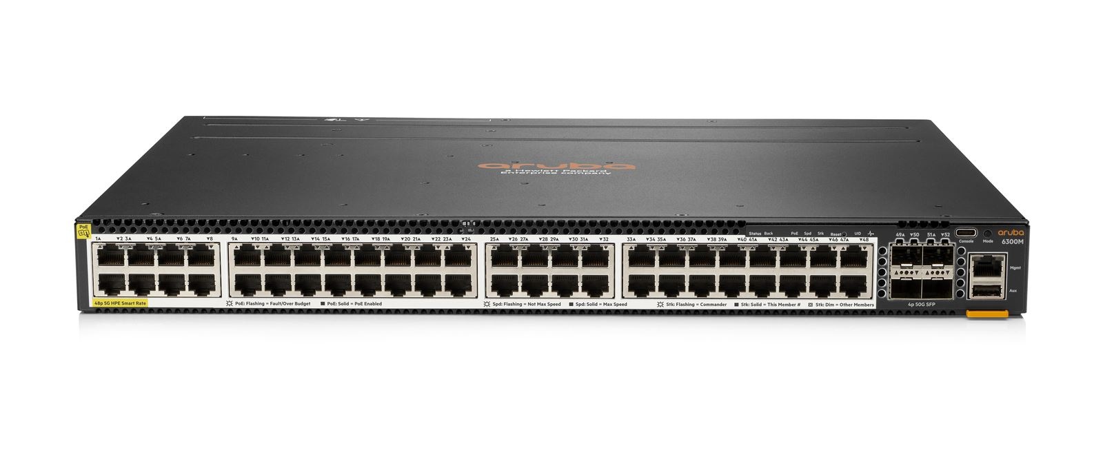 HPE Aruba Networking 6300M 48-port 1GbE Class 4 PoE and 4-port SFP56 Switch.