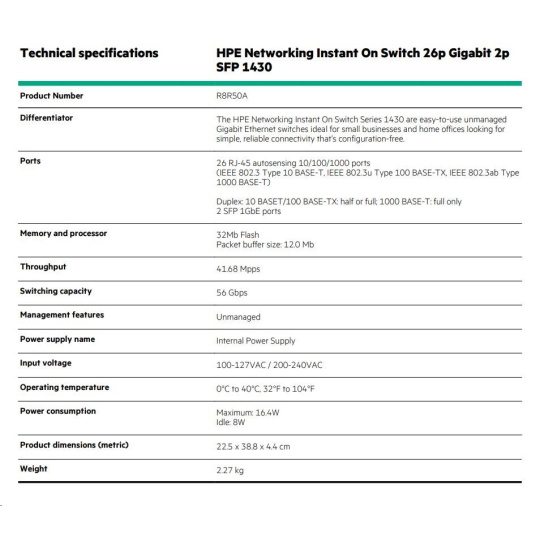 HPE Networking Instant On Switch 26p Gigabit 2p SFP 1430 R8R50A