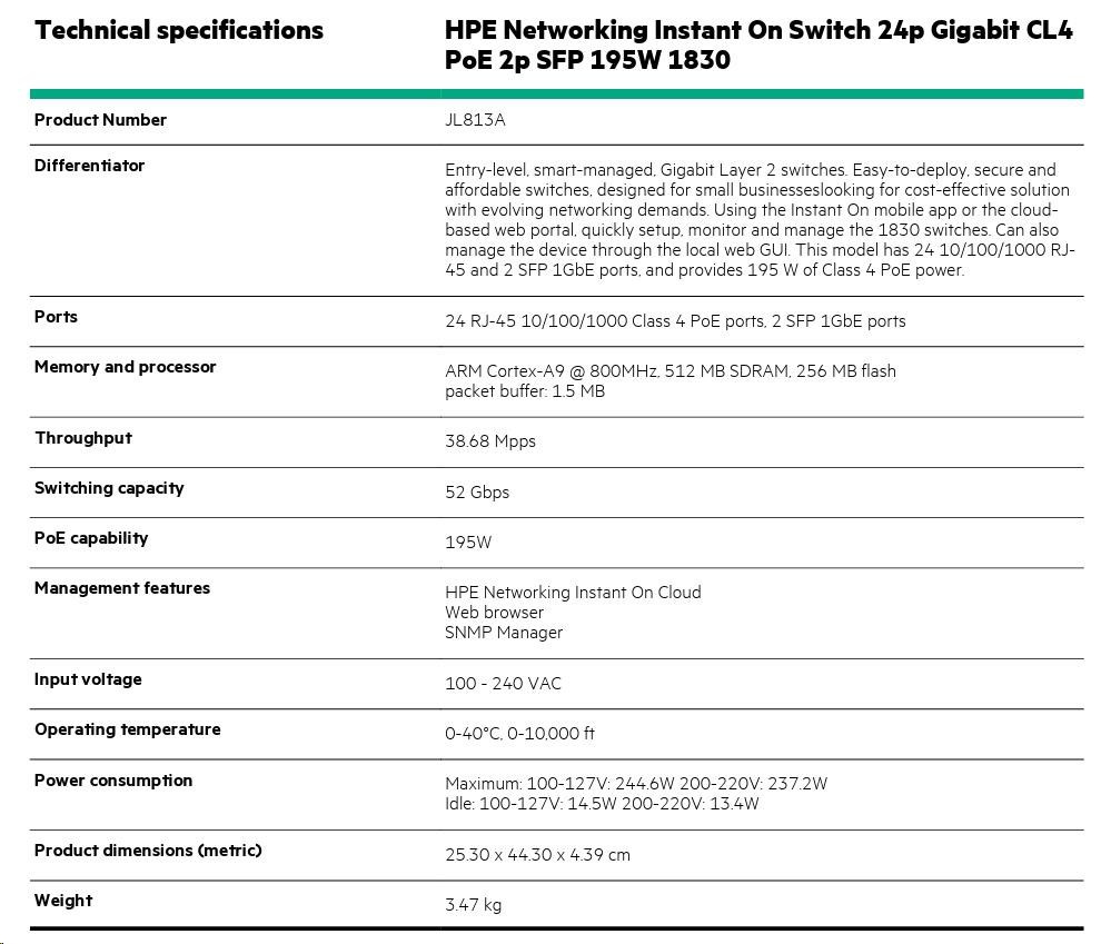 | Aruba Instant On 1830 8G Switch (JL810A) | Aruba Instant On 1830 8G 4p Class4 PoE 65W Switch (JL811A) | Aruba Instant On 1830 24G 2SFP Switch (JL812A) | Aruba Instant On 1830 24G 12p Class4 PoE 2SFP 195W Switch (JL813A) | Aruba Instant On 1830 48G 4SFP Switch (JL814A) | Aruba Instant On 1830 48G 24p Class4 PoE 4SFP 370W Switch (JL815A) | ||||||||