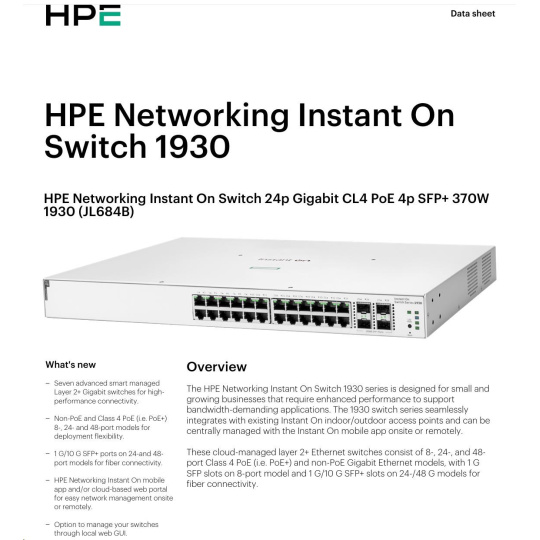 The Aruba Instant On 1930 switches features advanced, smart-managed, fixed- configuration Gigabit switches designed for small businesses that are easy-to-deploy and affordable. They're made to handle today's bandwidth-heavy applications like voice and video conferencing, enabling consistent connectivity to enhance performance.