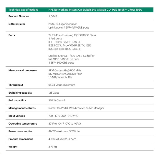 | Device Management | Aruba Instant On Cloud; Web browser; SNMP Manager | |