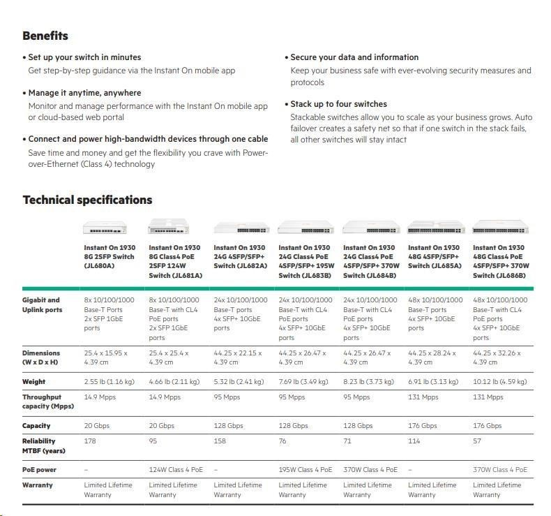 The Aruba Instant On 1930 switches features advanced, smart-managed, fixed- configuration Gigabit switches designed for small businesses that are easy-to-deploy and affordable. They're made to handle today's bandwidth-heavy applications like voice and video conferencing, enabling consistent connectivity to enhance performance.