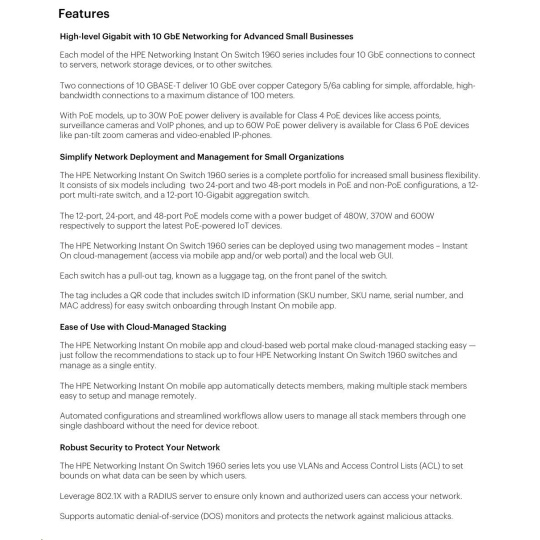 HPE Networking Instant On Switch 8p Gigabit CL4 4p SR2.5G CL6 PoE 2p 10GBT 2p SFP+ 480W 1960