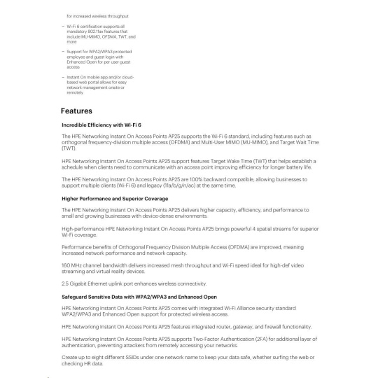 | Next-Generation 802.11ax Wi-Fi Features AP25 is a Wi-Fi CERTIFIED 6TM (Wi-Fi 6) access point that brings higher capacity, efficiency, and performance to small and growing businesses with dense deployments. With a maximum aggregate data rate of 5.3 Gbps, AP25 access points deliver the speed and reliability small businesses need. 2.5g Ethernet Uplink Port And 160mhz Client Bandwidth Support Availability of 2.5G uplink port and wider channel bandwidth delivers faster Wi-Fi speeds for activities like high-def video streaming and gaming. 160mhz Client Bandwidth Support With 160MHz bandwidth support in 11ax, HE160 mode delivers higher performance with 160MHz supported clients. The mesh performance can be doubled with the 160MHz bandwidth support on 5GHz backhaul. Orthogonal Frequency-Division Multiple Access (OFDMA) Allows access points (APs) to handle multiple Wi-Fi 6-capable clients on each channel simultaneously - regardless of device or traffic type. This improves efficiency by boosting overall capacity while reducing latency. Target Wake Time (TWT) Ideal for devices that communicate infrequently, TWT establishes a schedule for clients to communicate with an AP. This helps reduce power consumption, extending battery life.