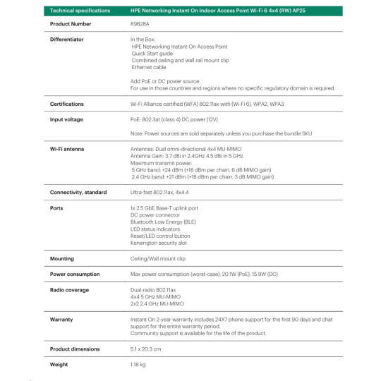 HPE Networking Instant On Indoor Access Point Wi-Fi 6 4x4 (RW) AP25 (R9B28A)
