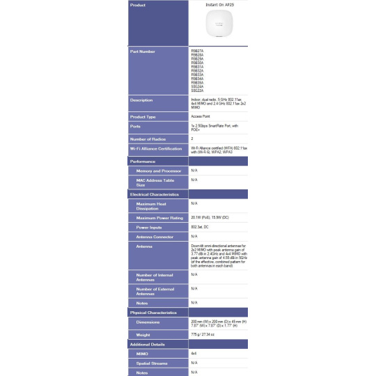 | Ultra-high-speed performance for high-density small businesses. Perfect for gaming, boutique hotels, tech start-ups and professional offices. The rise of the remote and hybrid workplace has placed increased pressure on business networks. Existing Wi-Fi infrastructure is struggling to support the explosion of devices and bandwidthhungry applications - all contributing to spotty video calls and sluggish download speeds. The Aruba Instant On AP25, a 4x4 Wi-Fi 6 access point, is designed to meet the increasing volume of connected devices. Delivering superior performance, coverage, and speed at a competitive price, the AP25 is the perfect access point for small and growing businesses. The Wi-Fi Certified 6TM AP25 delivers faster Wi-Fi speeds, greater capacity, and reduced latency between access points and devices for a superior Wi-Fi experience. AP25 improves efficiency and reduces congestion for networks with many connected devices, making it ideal for high-density environments. And with 4x the capacity of 802.11ac access points, the AP25 provides exceptional user experience, allowing businesses to serve more customers with higher speed and less congestion. Features of the AP25 include orthogonal frequency-division multiple access (OFDMA), multi-user MIMO and target wake time (TWT). With up to 4 spatial streams (4SS) and 160MHz channel bandwidth (HE160), the AP25 provides groundbreaking wireless capabilities for businesses looking to boost performance and future-proof their networks. |
