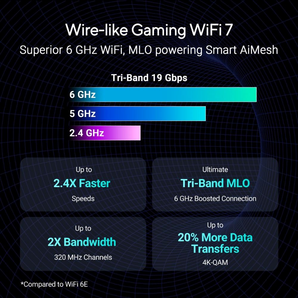 WiFi 7 (IEEE 802.11be) obsahuje všechny výhody WiFi 6/6E a rozšiřuje několik stávajících standardů WiFi na zcela novou úroveň, například šířku pásma 320 MHz a 4K-QAM. Zavádí také některé revoluční funkce, jako je například provoz s více linkami. Tyto kombinované technologie poskytují nadstandardně vysoké rychlosti, extrémně nízkou latenci a zvýšenou spolehlivost. Můžete si tak vychutnat bezkonkurenční síťové zážitky na jakémkoli online bojišti.