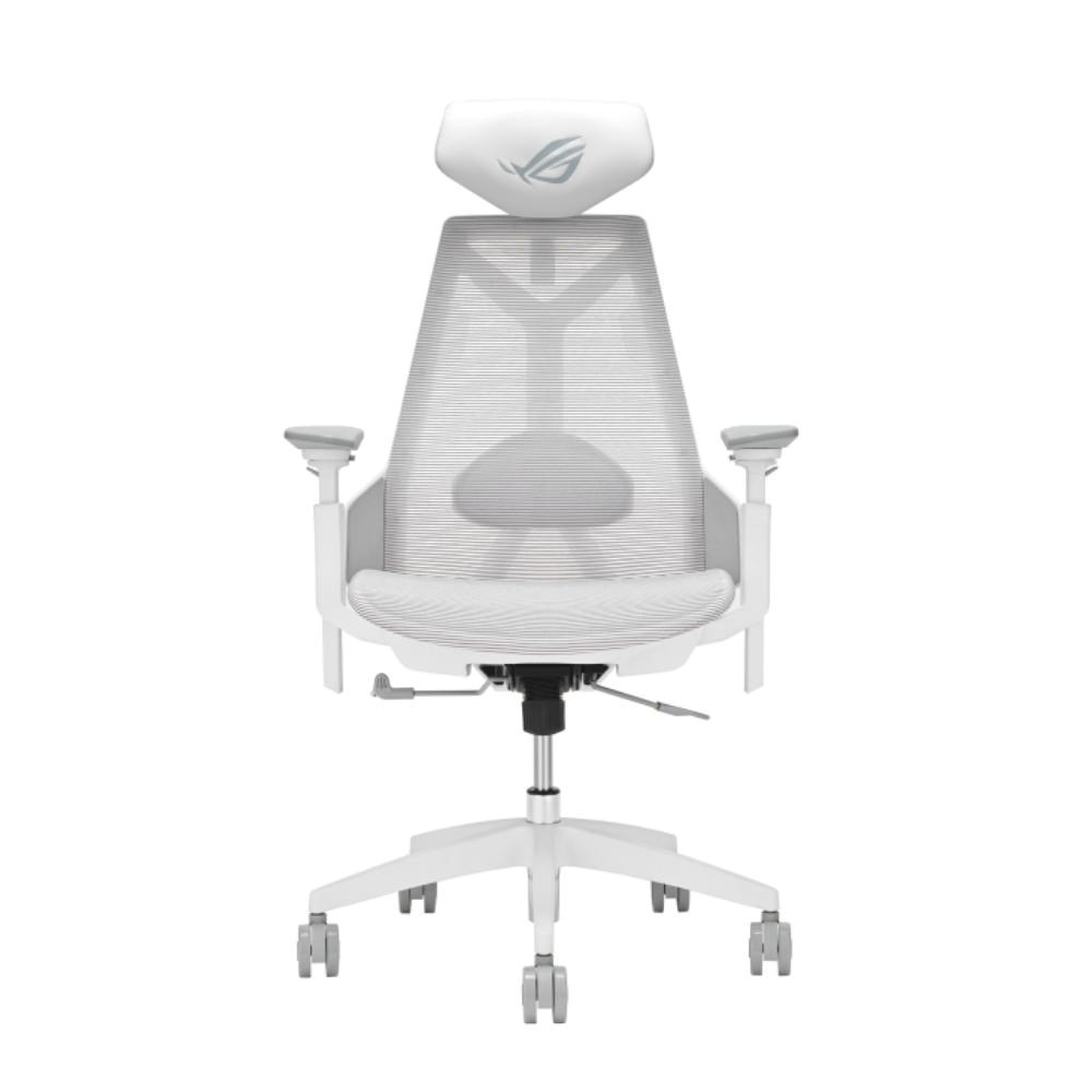 Herní židle ROG Destrier Core ergo s futuristickou estetikou, všestranným nastavením sedadla pro dokonalé držení těla, mobilní herní opěrky rukou a vyrobená z odolného polyamidového nylonu a prodyšné síťoviny pro pohodlné herní maratony.