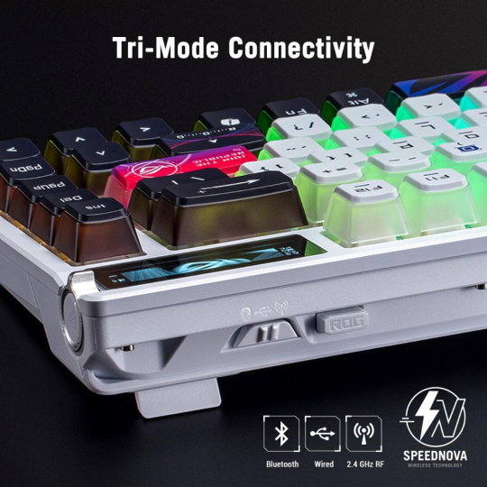 - Trojrežimové připojení: Připojení přes Bluetooth® (až tři zařízení současně), 2,4 GHz s bezdrátovou technologií ROG SpeedNova nebo kabelové připojení USB