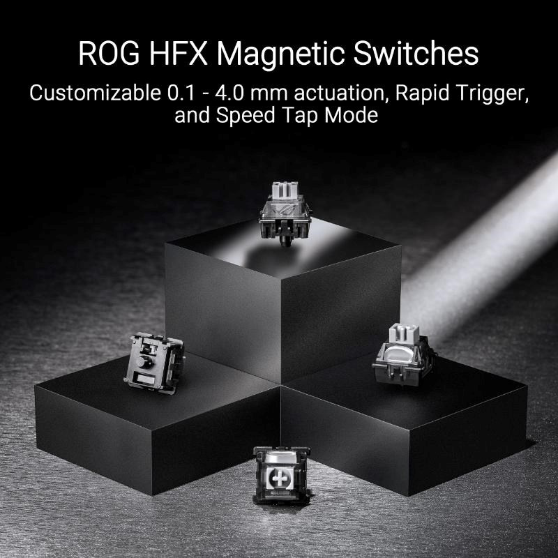 - Magnetické spínače ROG HFX: Má přizpůsobitelné ovládání 0,1 - 4,0 mm pro okamžité stisknutí kláves