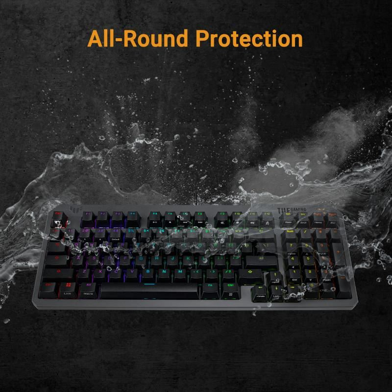 Klávesnice ASUS TUF Gaming K3 Gen II s kompaktním rozložením 97 kláves, opticko-mechanickými RGB přepínači, silikonovým těsněním, tlumicí pěnou, vodotěsností IP57, odnímatelnou horní deskou a kompatibilitou Aura Sync.