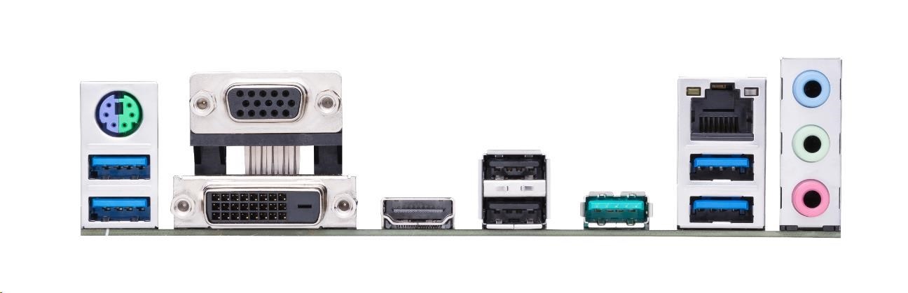 | Back I/O Ports | 1 x PS/2 keyboard/mouse combo port(s) 1 x DVI-D 1 x D-Sub 1 x HDMI 1 x LAN (RJ45) port(s) 1 x USB 3.2 Gen 2 (teal blue) (1 x Type-A) 4 x USB 3.2 Gen 1 (blue) Type-A 2 x USB 2.0 3 x Audio jack(s) |