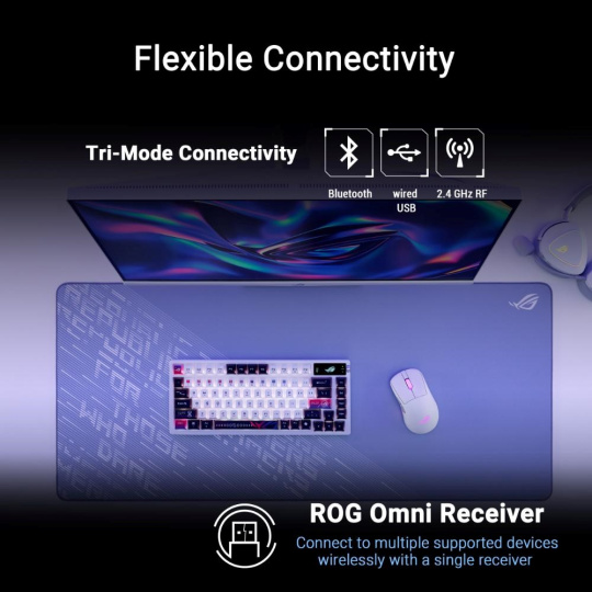 - Ultrarychlý bezdrátový výkon: Všestranné možnosti připojení: 2,4GHz bezdrátové RF, Bluetooth® a kabelové USB; přibalený přijímač ROG Omni podporuje bezdrátové připojení více zařízení pomocí jediného přijímače