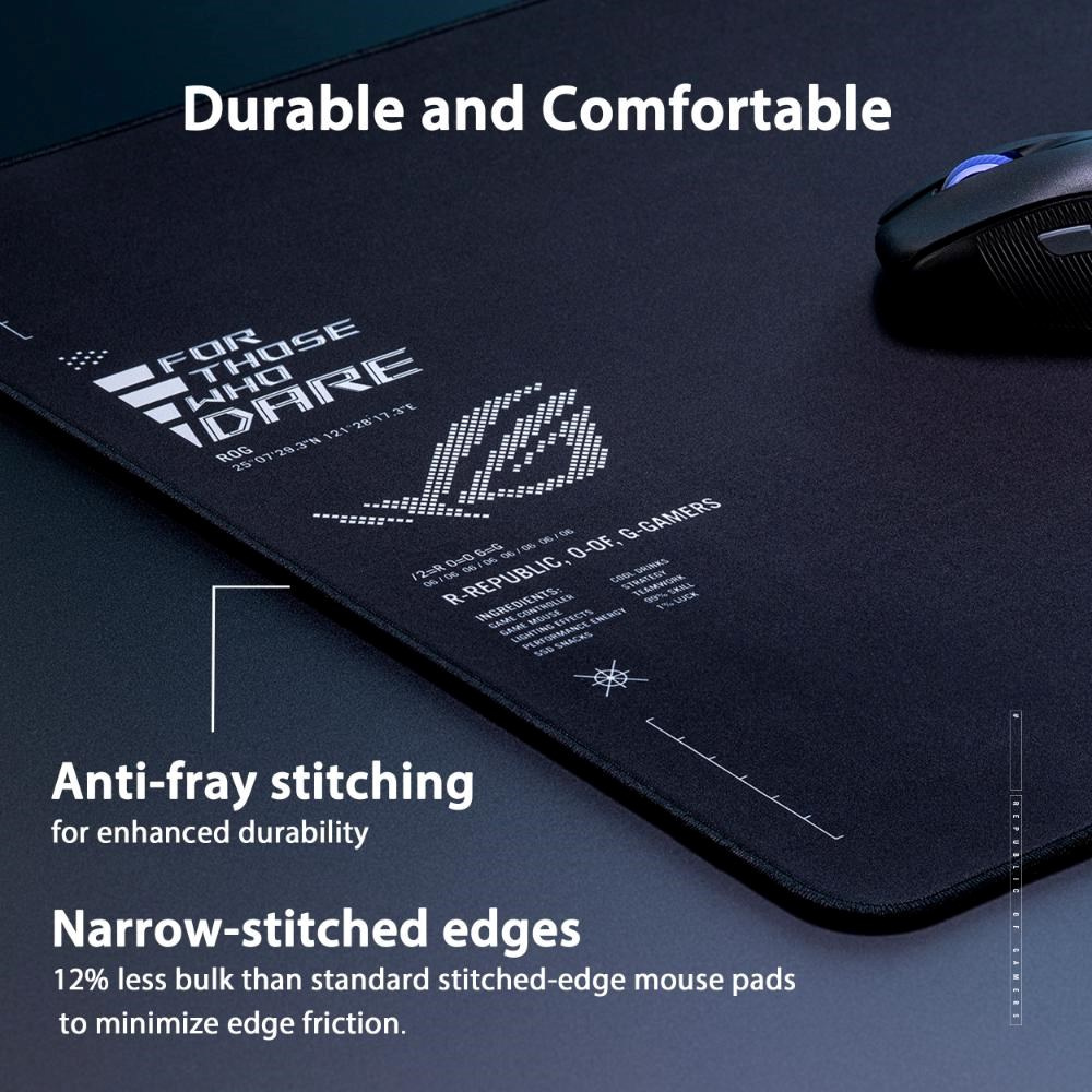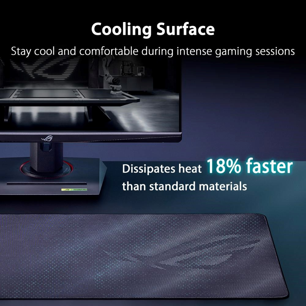ROG Sheath II XXL je velká herní podložka pod myš s pokročilou chladicí tkaninou a plochými šitými okraji proti oděru a protiskluzovou gumovou základnou
