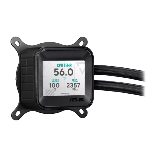 All-in-one vodní chladič procesoru ASUS Prime LC ARGB LCD s ostrým displejem zobrazujícím informace o procesoru a grafické kartě s různým pozadím, vysoce výkonným čerpadlem Asetek vybaveným robustním motorem a ventilátory s možností řetězení.