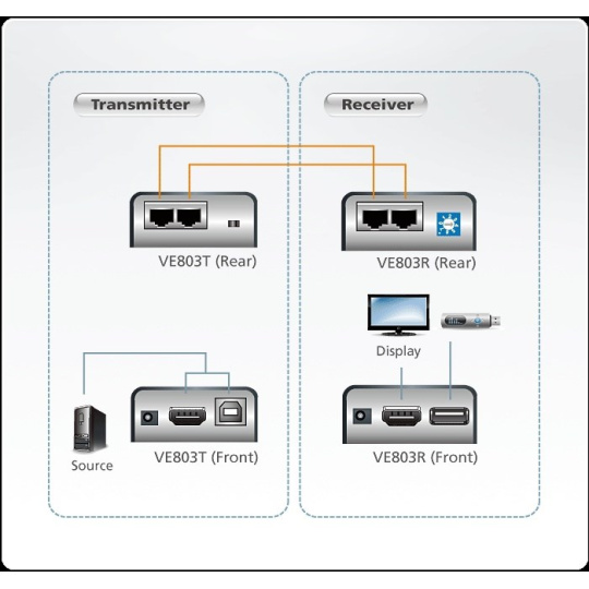 VE803 ATEN HDMI + USB Extender do 60m Aten VE803 je HDMI a USB Extender, který umožní posílit a přenést signál HDMI a USB mezi zdrojem a zařízením až na 60m ve vynikající kvalitě. Umožní prodloužit např. signál z počítače do monitoru/TV a klávesnice/myši/flashdisku po ethernetovém kabelu. Zařízení se propojuje Cat5E kabelem s RJ45 konektory mezi jednotkami (není součástí, nesmí být zapojen do živé sítě). Vlastnosti: - vzdálenost kabelů mezi jednotkami až 60m (1080i), 40m (1080p) - podpora vysokých rozlišení: HDTV 480p, 720p, 1080i a 1080p & Podpora počítačových formátů: VGA, SVGA, XGA, SXGA (1280x1024), UXGA(1600x1200) a WUXGA(1920x1200). - plně kompatibilní s HDMI 1.3b specifikacemi - HDCP kompatibilní - podpora 3D, Deep Color, až 2.25Gbps přenosové pásmo - 8 stupňová ekvalizace kvality a síly signálu - podpora Dolby True HD, DTS HD Master Audio norem zvuku - vestavěná 8KV/15KV ESD ochrana - podpora USB touch panelů - podpora USB2.0 zařízení (až 12Mbps) - podpora širokoúhlých formátů - napájení lokální jednotky z USB portu - Plug and play, jednoduchá instalace - kompaktní design - jednoduše propojí různé typy zdrojů a zařízení: LCD Monitor , Projector , LCD TV.... - multiplatformní podpora: Windows 2000/XP/ Vista/7/8/Linux/Mac a SUN. - části zařízení se propojují dvěmi Cat5e nebo Cat6 kabely (není součástí),které musí být zapojeny napřímo, nesmí jít přes žádný aktivní prvek, switch apod., doporučujeme ideálně drát, průřez AWG23 - doporučujeme použít kvalitní jeden přímý propojovací UTP kabel, např: kód:sutpd6c1 PremiumCord TP Kabel 4x2,drát UTP Cat6 AWG23,čistá měď 100m Extender se nesmí zapojit do aktivní počítačové sítě LAN, do switche, routeru nebo do jiného aktivní síťového zařízení. Vysílač a přijímač extenderu musí být přímo propojen LAN kabelem, nejlépe bez přerušení. Konektory: 1x HDMI vstup samice 1x USB typ B samice 1x HDMI výstup samice 1x USB typ A samice 4x RJ-45 samice na propojení obou částí zařízení V balení: 1 VE800L (místní jednotka) 1 VE800R (vzdálená jednotka) 1 napájecí adaptér 1 uživatelská příručka.
