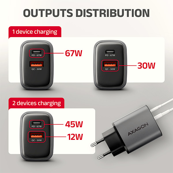AXAGON ACU-PQ67 GaN nabíječka do sítě 67W, USB-A + USB-C, PD3.0/PPS/QC4+/SFC2.0/Apple