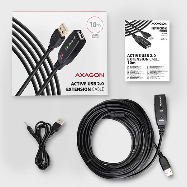 Aktivní prodlužovací USB 2.0 kabel AXAGON ADR-210 délky 10 metrů je ideální k propojení Vašeho počítače s USB zařízením jako je myš, klávesnice, webkamera, tiskárna, skener, plotr a dalšími. Aktivní USB repeater kabel zesiluje průchozí signál a umožnuje připojit USB zařízení na výrazně větší vzdálenost, než Vám umožní pasivní kabel. Dosah kabelu je možné dále prodloužit použitím několika kabelů za sebou.