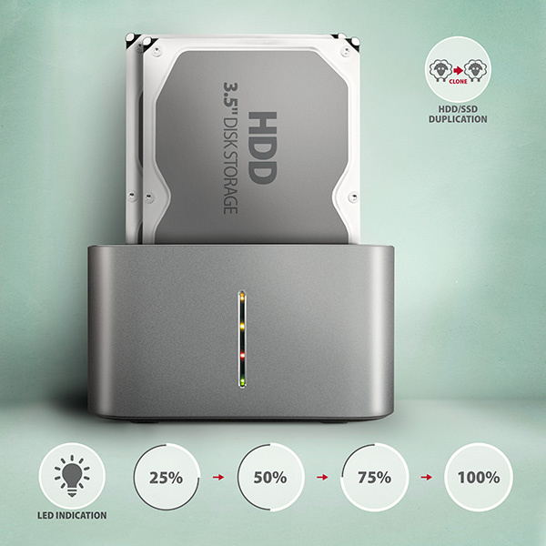 Dokovací stanici také využijete pro snadné klonování obsahu připojených disků bez potřeby připojení k PC. Do prvního slotu stanice HDD A (source) zasunete zdrojový disk a do druhého slotu HDD B (target) zasunete cílový disk. Pak jen zmáčknete klonovací tlačítko a sledujete průběh klonování na stupnici čtyř LED diod. Po zkopírování všech dat je na cílovém disku přesná kopie původního disku. Dock tak lze využít jako autonomní zařízení pro pohodlné duplikování a vytváření obrazů disků. Jedná se o nejjednodušší způsob, jak přenést obsah starého HDD disku na nový SSD disk, a to včetně funkčního operačního systému (Windows, macOS, Linux …).