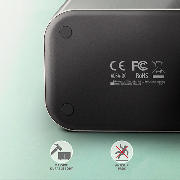 Skříň stanice je dostatečně robustní a odolná, což umožňuje dokonalou stabilitu i s vloženými disky. Gumové nožky omezují posouvání po stole a vibrace pevných disků. Vnější plášť je proveden z hliníku s elegantním broušeným povrchem.