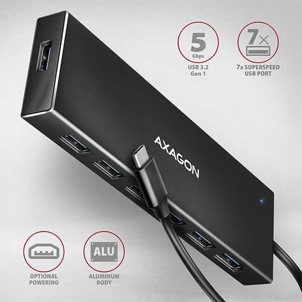 AXAGON HUE-F7C, 7x USB 3.2 Gen 1 ALU FLAT CHARGING hub, micro USB napájecí konektor, kabel USB-C 30cm