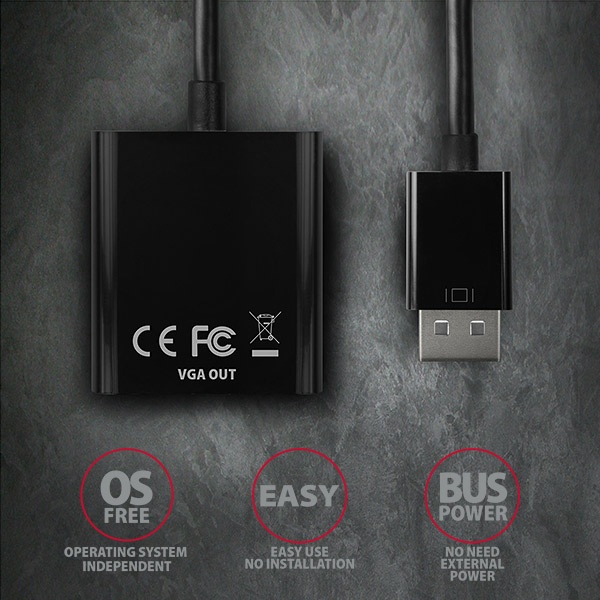 DisplayPort -> VGA aktivní adaptér AXAGON RVD-VGN pro připojení staršího VGA monitoru/TV/projektoru k počítači nebo jinému zařízení s výstupem Display Port.