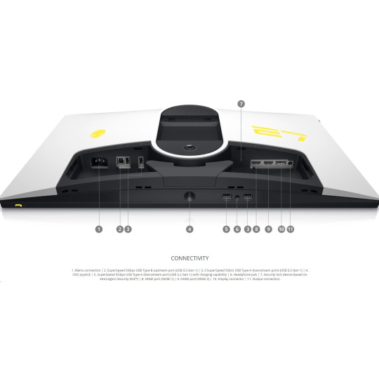 | 1. Mains connection 2. SuperSpeed 5Gbps USB Type-B upstream port (USB 3.2 Gen 1) 3. 3 SuperSpeed 5Gb/s USB Type-A downstream ports (USB 3.2 Gen 1) 4. OSD joystick 5. SuperSpeed 5Gbps USB Type-A downstream port (USB 3.2 Gen 1) with charging capability 6. Headphone jack 7. Security lock device (based on Kensington Security Slot™) 8. HDMI port (HDMI 1) 9. HDMI port (HDMI 2) 10. Display connector 11. Output connection |