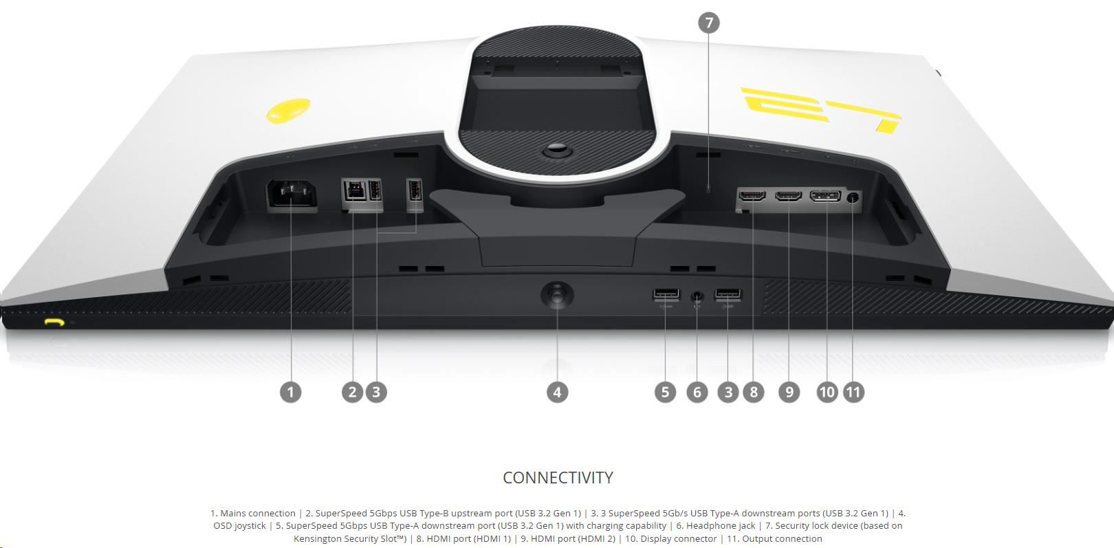 | 1. Mains connection 2. SuperSpeed 5Gbps USB Type-B upstream port (USB 3.2 Gen 1) 3. 3 SuperSpeed 5Gb/s USB Type-A downstream ports (USB 3.2 Gen 1) 4. OSD joystick 5. SuperSpeed 5Gbps USB Type-A downstream port (USB 3.2 Gen 1) with charging capability 6. Headphone jack 7. Security lock device (based on Kensington Security Slot™) 8. HDMI port (HDMI 1) 9. HDMI port (HDMI 2) 10. Display connector 11. Output connection |