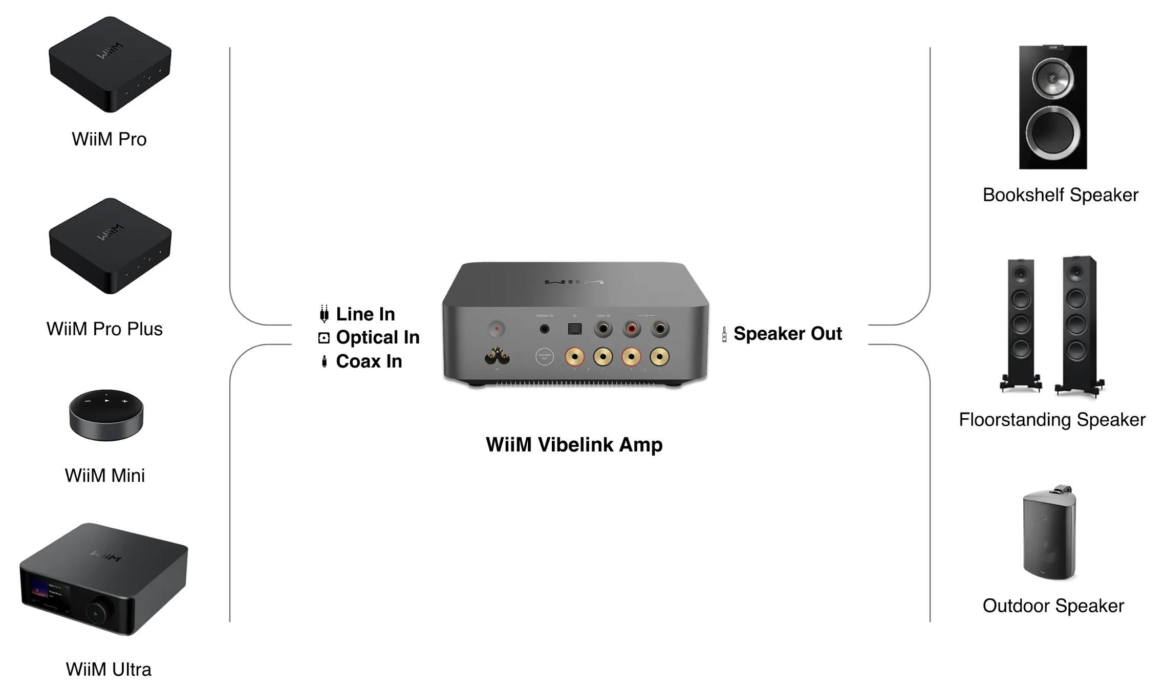 Vibelink Amp je HiFi zesilovač od WiiM navržený pro použití s moderními firemními streamovacími zařízeními, podobně jako jsou WiiM Mini, Pro, Pro Plus či Ultra, ale tím že je vybaven pečlivě vybranými komponenty vysoké kvality z něj dělá ideálního společníka také pro vaše audio komponenty vysoké kvality (CD / Streamery, BD/DVD přehrávače, Gramofony s apod.)