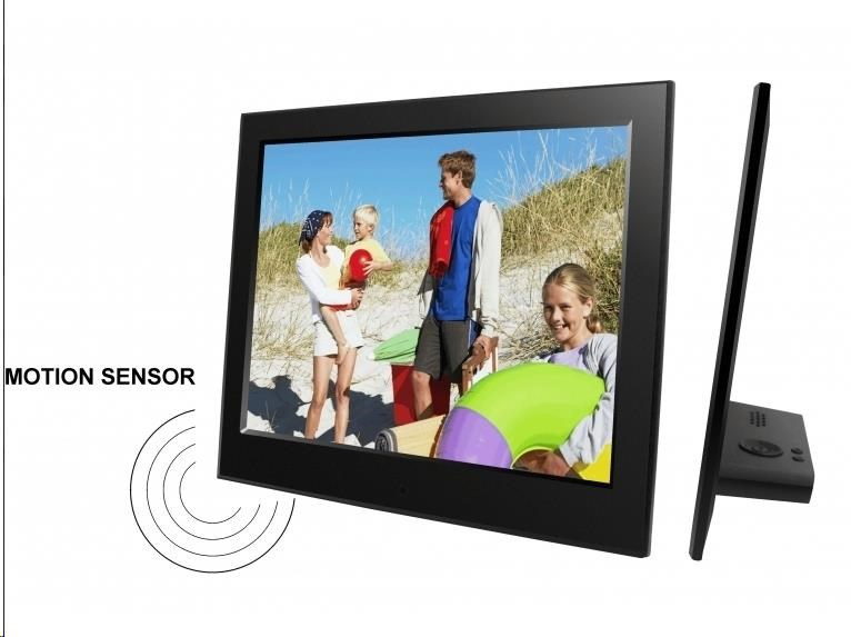 Digitální fotorámeček s úhlopříčkou 8", ultratenký 6,5 mm s opěrkou, vysoké rozlišení 1280x800px, 16:10, Motion Senzor pohybu, prohlížení obrázků ve formátu JPEG, poslech hudby MP3/WMA a přehrávání videa Full HD MPEG1/2/4, multislot SD/MS a USB2 flash max 32GB, Audio out, Auto Start/ON/OFF, funkce: SlideShow (prezentace), náhledy, zoom a otáčení obrázků, budík, hodiny, kalendář. Rozměr: 220x176x23 mm, hmotnost 440 g. Součástí dodávky síťový zdroj AC/DC 5V/1,5A, dálkové ovládání.