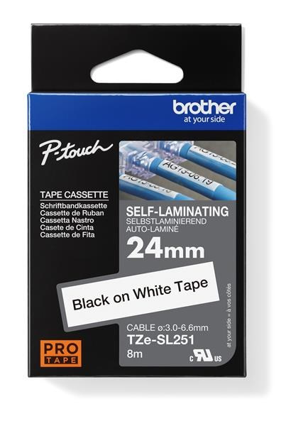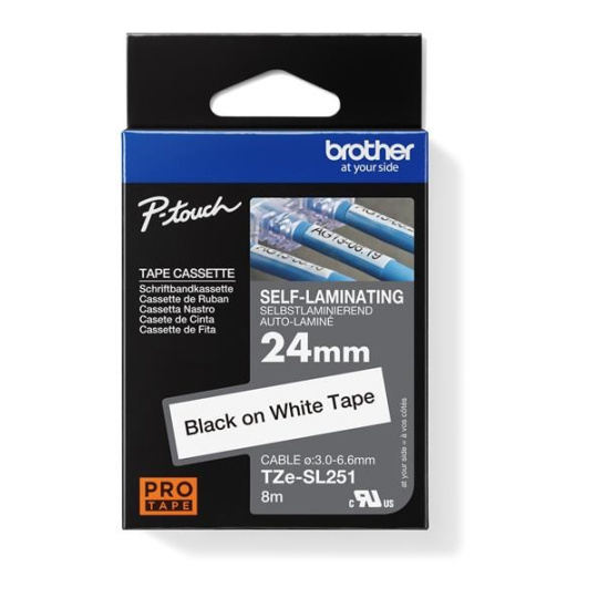 Samolaminovací páska TZe-SL251 s délkou 24 mm s černým tiskem na bílé byla vyvinutá pro dlouhodobou identifikaci síťových kabelů. Má speciální lepicí vlastnosti štítků pro trvanlivé pevné ovinutí kolem vašich vodičů a kabelů. Kompatibilní s některými modely P-touch, které používají pásky TZe 24 mm a 36 mm.