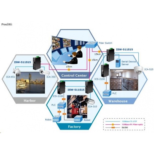 Planet ISW-511, 4x 10/100Base-TX+ 1x 100FX 2km, MM, DIN, IP30 Přepínače pro průmyslový Ethernet jsou určeny do náročných provozních podmínek s velkým rozsahem pracovních teplot, nejistým napájením a častými otřesy. Přepínače řady ISW se snadno instalují na standardní DIN lištu nebo přímo na zeď a umožňují nasazení dobře známé Ethernetové technologie i v průmyslovém prostředí. Stejně tak jsou vhodné pro instalace do venkovně umístěných skříní s velkým kolísáním pracovních teplot (typicky bezdrátové a MAN ISP aplikace). Vlastnosti: - 4 porty 100Base-TX, Switching, Full Duplex (100/200 Mbps), Auto-Negotiation (10/100 Mbps), automatická detekce přímý/křížený kabel na každém portu - 1 port 100Base-FX, full duplex, SC konektory, multimodemode, pro 50/125um a 62,5/125um vlákno, dosah 2km, vlnová délka 1300nm, zdvih min. 15,5dB (vysílací výkon max. -14dBm, min. -19dBm, přijímací citlivost -34,5dBm) - 1M buffer, propustnost sběrnice 1Gbps - pole LED indikátorů pro diagnostiku provozu - instalace na DIN lištu, montážní díl součástí - instalace na zeď, montážní díl součástí - krytí IP30, skříň celohliníková - napájení: 12-48V DC redundantní, připojení možné ze dvou různých zdrojů (nejsou součástí balení) - ochrana proti přepólování, připojení napájení na svorkovnici, umístění na spodním panelu (nepřekáží při montáži na zeď) - QoS prioritizace provozu dle portu, ToS, 802.1p - zařízení je odolné proti pádu (IEC-60068-2-32) z výšky 75cm na všechny dopadové části - zařízení je odolné proti vibracím (IEC-60068-2-6) 10-500-10Hz, 4x g, 0,5oct/min - zařízení je odolné proti přetížení krátkodobému zrychlení 50g, dlouhodobému 4g, (IEC-60068-2-27) - EMI/EMS, elektromagnetická kompatibilita a slučitelnost dle CE EN-6100-4-2,3,4,5,6 - elektrická bezpečnost dle CE EN-60950 - pracovní teplota -10 až 60 st. C, vlhkost do 95% - skladovací teplota -40 až 85 st. C - příkon 9,1W - rozměry 135 x 97 x 32 mm.