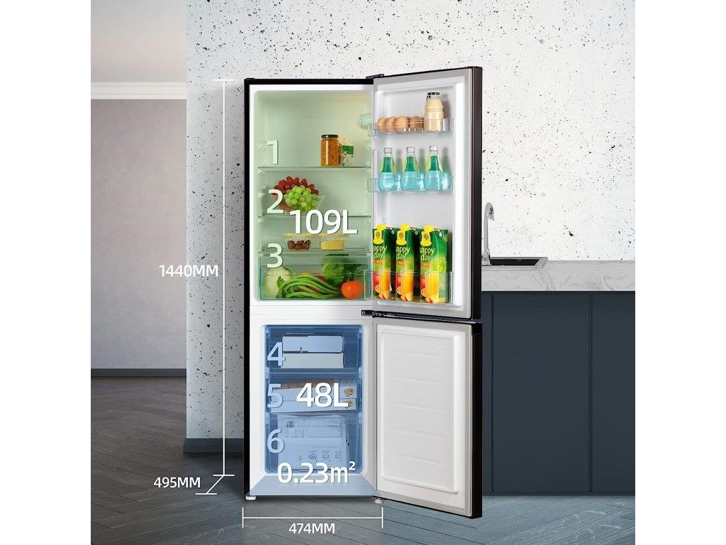 Kombinovaná lednice s mrazákem dole o celkovém objemu 157 litrů.