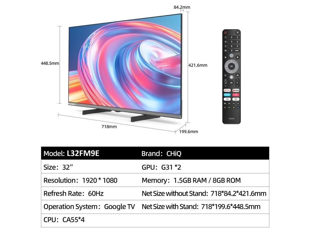 CHiQ 32“ L32FM9E, metalická bezrámečková Smart Google TV, HDR10 / HLG, obrazovka Full HD s rozlišením 1920 x 1080 pixelů