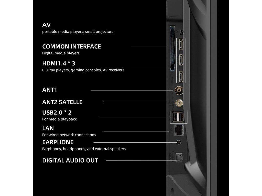 Vstupy a výstupy:AV vstup mini, CI+, digitální audio výstup, HDMI 2.1, USB 2.0, LAN, antény RF a LNB