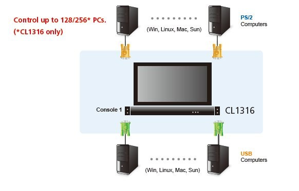 CL1316 ATEN 16-port KVM PS/2+USB, OSD, rack, 19" LCD, touchpad, klávesnice KVM přepínač s integrovanou klávesnicí, touchpadem a LCD 19" ve skladném vysouvacím šuplíku. Vhodný do serverové místnosti, kde Vám ušetří místo. Ke KVM přepínači je možno připojit až 16 PC s rozhraním USB nebo PS/2, je montovatelný do racku. Možnost přepínač ovládat tlačítek, klávesovou zkratkou nebo přes vestavěné OSD menu. - vestavěný 16 port KVM přepínač - vestavěný LCD 19" - kompletní klávesnice, touchpad - rozlišení LCD až 1280x1024@75 DDC2B - možnost připojit/odpojit PC bez restartu přepínače - není třeba software - přepínání pomocí hot key, tlačítka, OSD menu - auto scan mod pro zjištění připojených PC - kaskádovatelný - signalizace stavu pomocí několika LED diod - možnost připojit počítače po USB i PS/2 (řeší se kabely) - Broadcast mod - operace se realizuje na všech připojených PC najednou - včetně úchytů do racku 19" - dvou úrovňová ochrana heslem - podpora systémů Windows/Mac/Linux/Sun - černá barva Specifikace: konektory pro vstup sdružený 15p Canon třířadý Female (je třeba použít sdružený kabel!) Vhodné kabely: USB 2L-5202U 2L-5203U 2L-5206U PS/2 2L-5202P 2L-5203P 2L-5206P V balení: 1ks CL1316 KVM přepínač s držákem do racku 1ks napájecí kabel 2ks sady kabelů KVM pro připojení počítače 1ks Firmware Upgrade kabel 1ks Rychlý návod