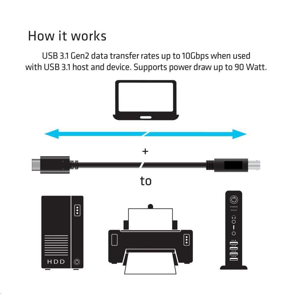 - Připojí zařízení typu USB-B k notebookům, tabletům a ultrabookům s rozhraním USB-C 3.1.