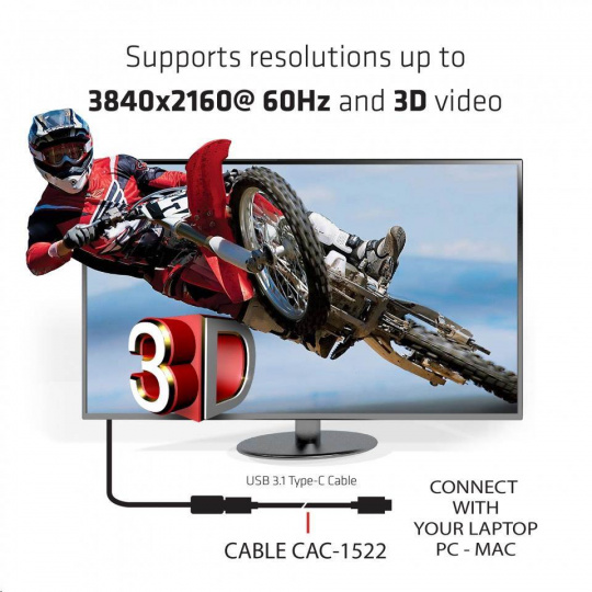 Club 3D USB 3.1 Type-C PD kabel umožňuje připojení notebooku, tabletu nebo telefonu s výstupem USB typu C k nejnovějším USB-C zařízením, příslušenstvím a nabíječkám. Nabízí přenos videa, dat a napájení přes jediný kabel a je vybaven čipem E-marker. E-marker je integrovaný obvod, který umožňuje připojeným zařízením identifikovat schopnosti kabelu.