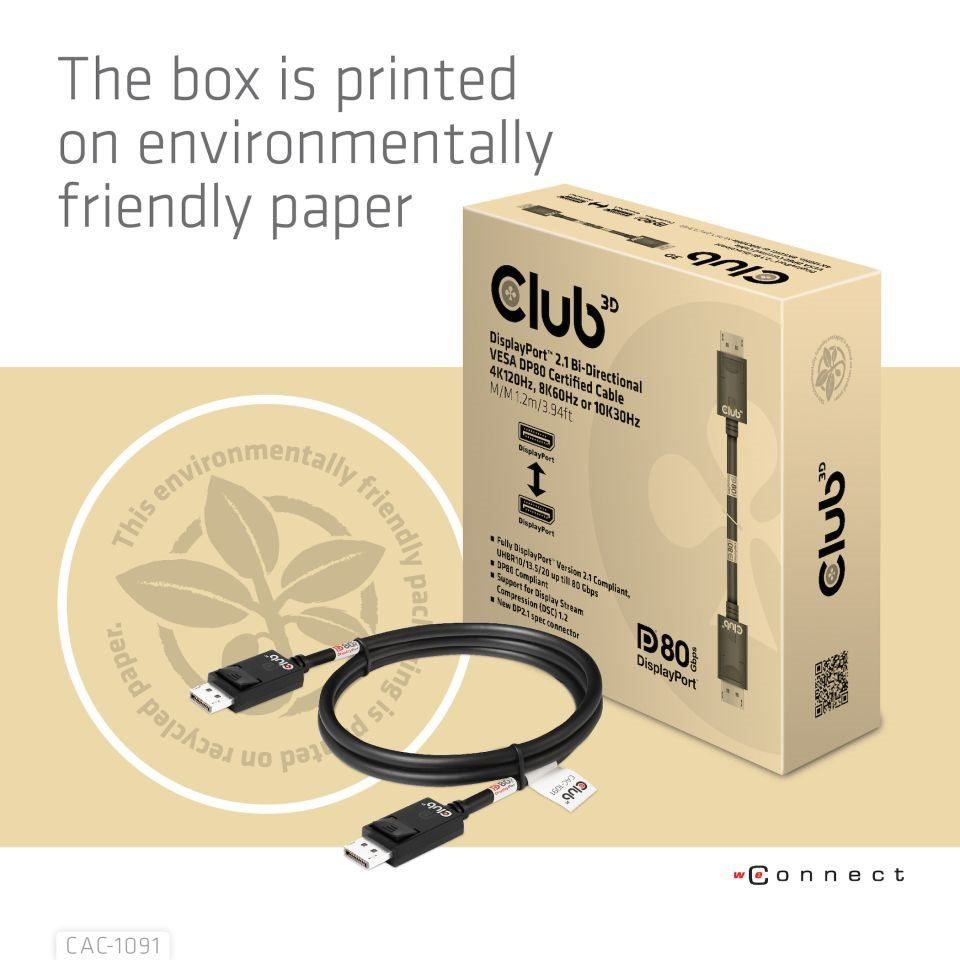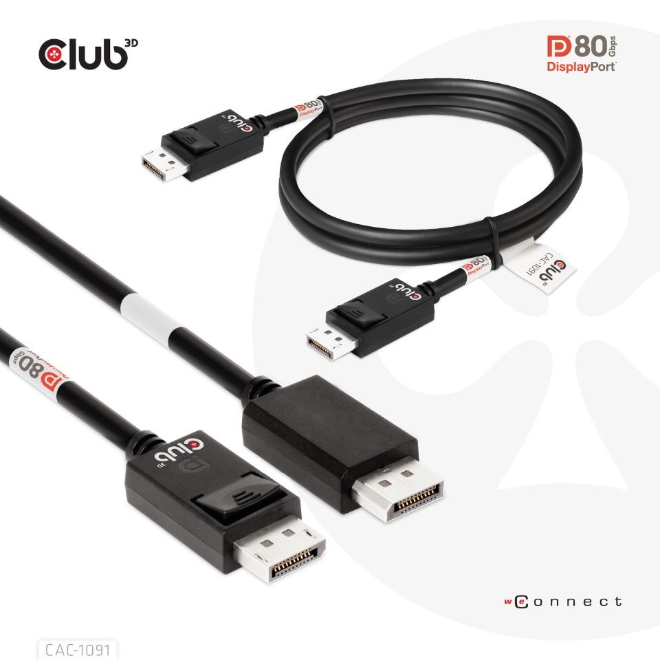 Kabel Club 3D CAC-1091 DisplayPort™ 2.1 umožňuje připojení vašeho (herního) PC nebo notebooku s podporou DisplayPort™ k (Ultra) monitoru s vysokým rozlišením nebo jinému zařízení s podporou DisplayPort™. DisplayPort™ 2.1 UHBR10/13.5/20 až 80 Gb/s, má také podporu pro Display Stream Compression 1.2 (DSC), Forward Error Correction a rozšiřuje maximální počet vložených audio kanálů na 32. Disponuje uzamykatelnými konektory DisplayPort™ zajišťujícími bezpečný , spolehlivé spojení, s NOVÝMI kontaktními prsty speciálně navrženými pro tyto vysoké rychlosti. Jednoduše stiskněte vestavěné jednodotykové tlačítko pro odemknutí konektoru. Měkký plášť UltraFlex chrání kabel před ohybem a poškozením deformací.